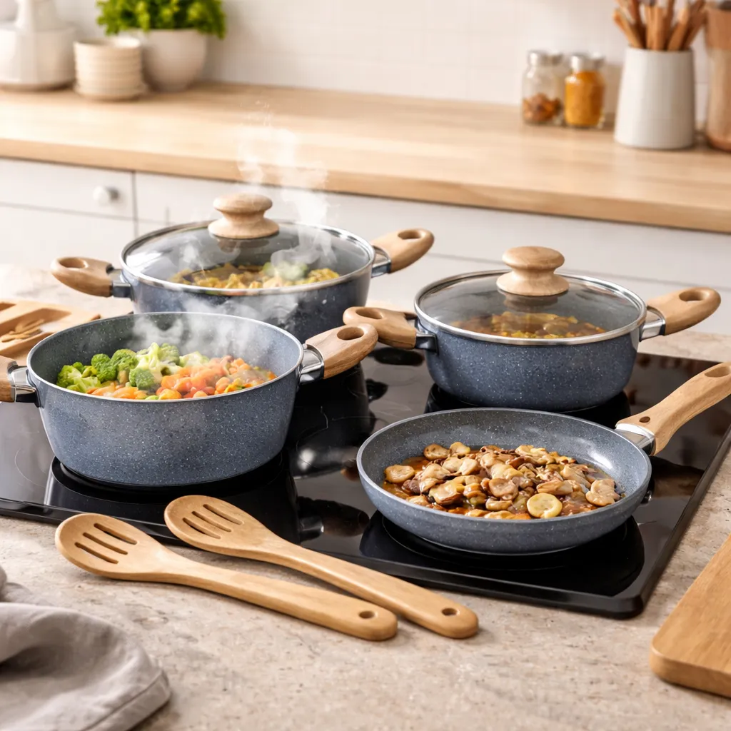 | Linha | Conjunto Cozinha 4 Itens Revestimento Stone Compatível Indução Vitrocerâmico Elétrico Gás Caçarolas Frigideira Utensílio |