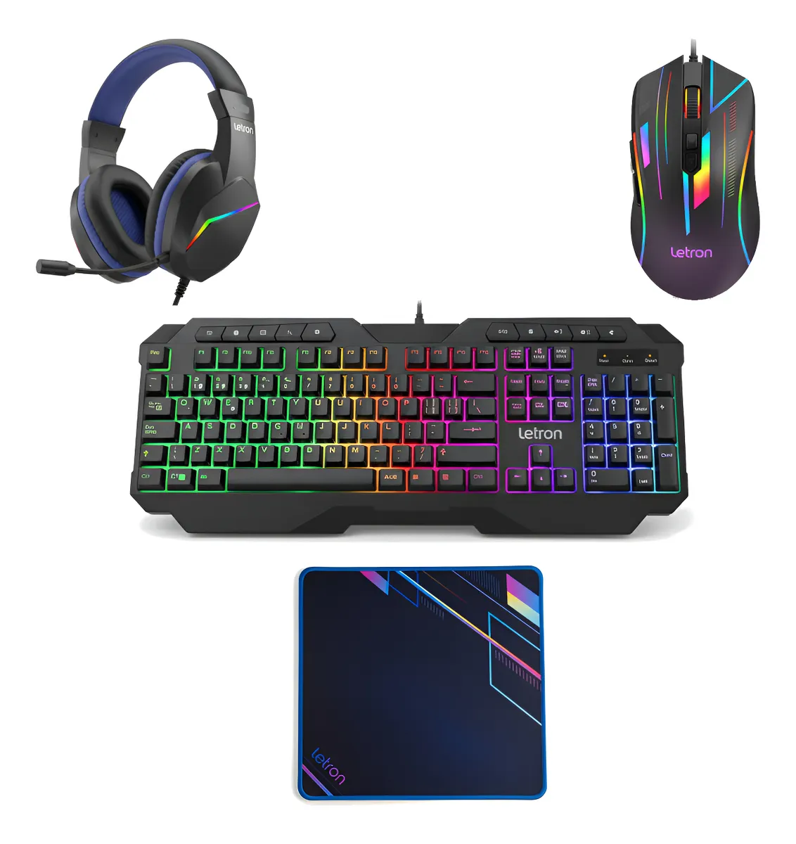 KIT GAMER 4X1 TECLADO MOUSE HEADSET MOUSEPAD LED RGB LETRON